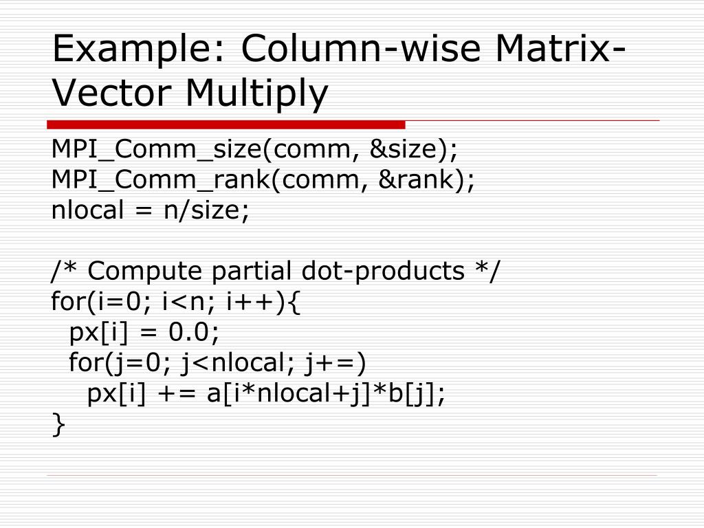 Example: Column-wise Matrix-Vector Multiply MPI_Comm_size(comm, &size); MPI_Comm_rank(comm, &rank); nlocal = n/size; /* Compute partial dot-products */ for(i=0; i<n; i++){ px[i] = 0.0; for(j=0; j<nlocal; j+=) px[i] += a[i*nlocal+j]*b[j]; }