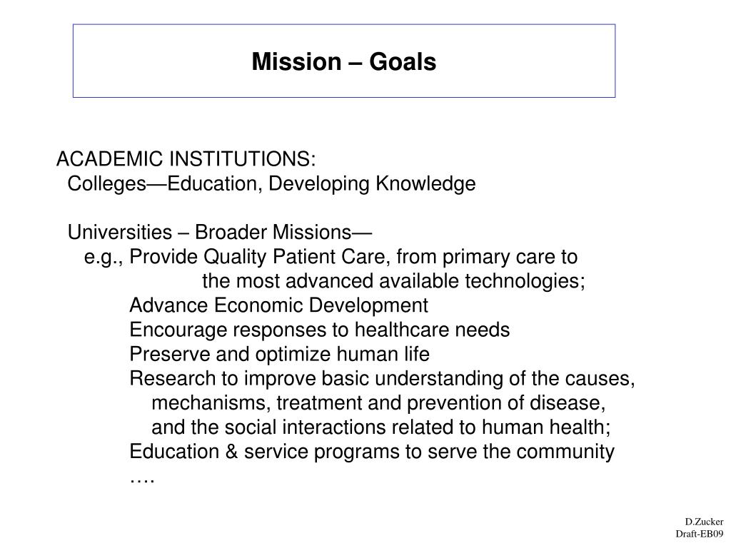 Mission – Goals • ACADEMIC INSTITUTIONS: • Colleges—Education, Developing Knowledge • Universities – Broader Missions— • e.g., Provide Quality Patient Care, from primary care to • the most advanced available technologies; • Advance Economic Development • Encourage responses to healthcare needs • Preserve and optimize human life • Research to improve basic understanding of the causes, • mechanisms, treatment and prevention of disease, • and the social interactions related to human health; • Education & service programs to serve the community • ….