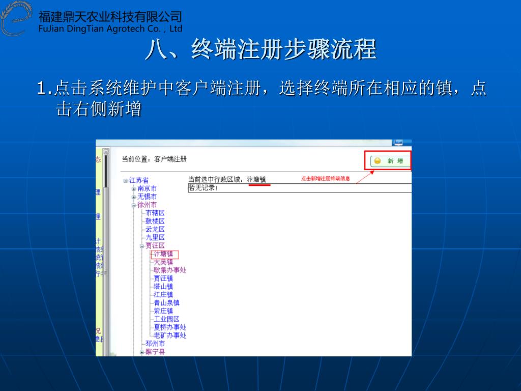 八、终端注册步骤流程 1.点击系统维护中客户端注册,选择终端所在相应的镇,点击右侧新增