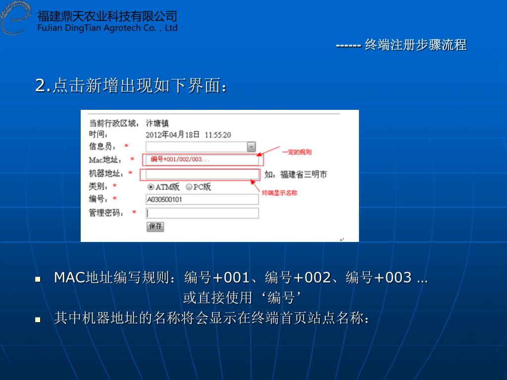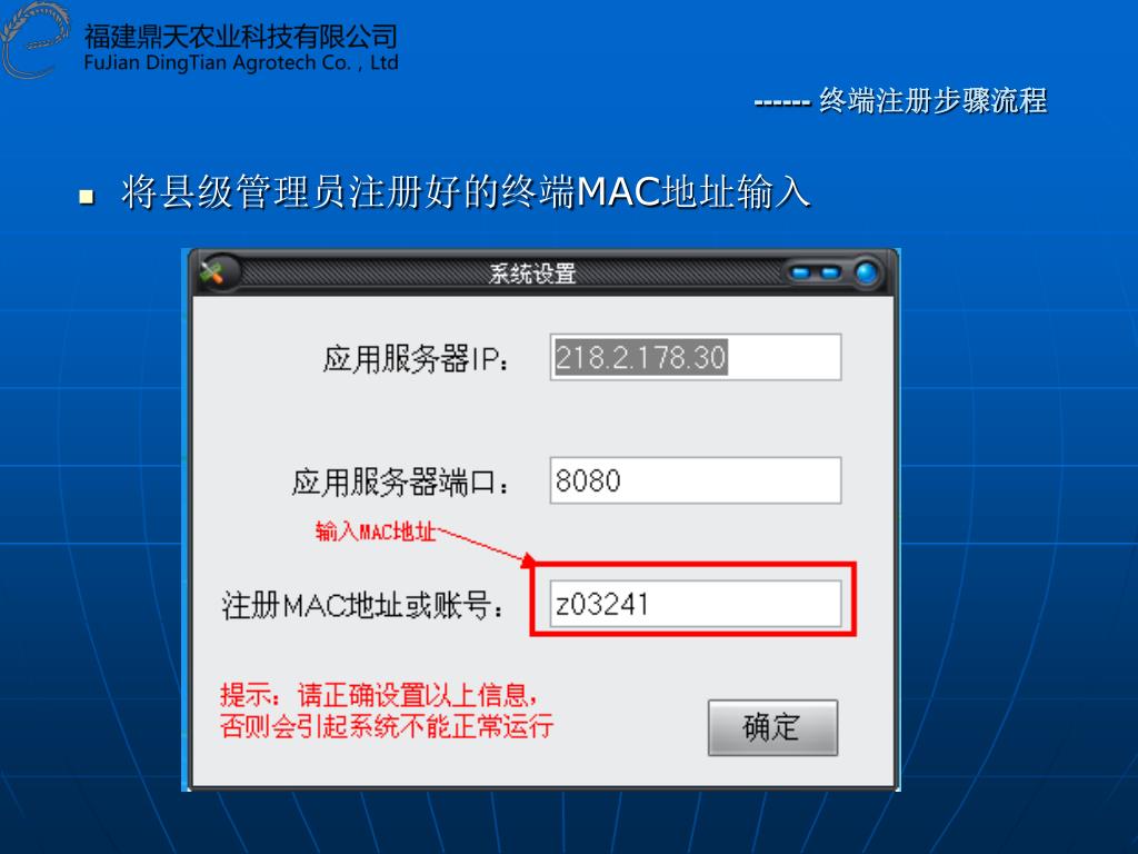 ------ 终端注册步骤流程 • 将县级管理员注册好的终端MAC地址输入