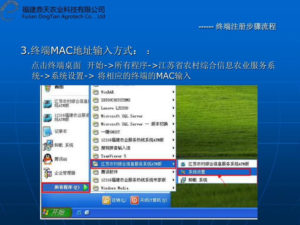 ------ 终端注册步骤流程 3.终端MAC地址输入方式: : 点击终端桌面 开始->所有程序->江苏省农村综合信息农业服务系统->系统设置-> 将相应的终端的MAC输入