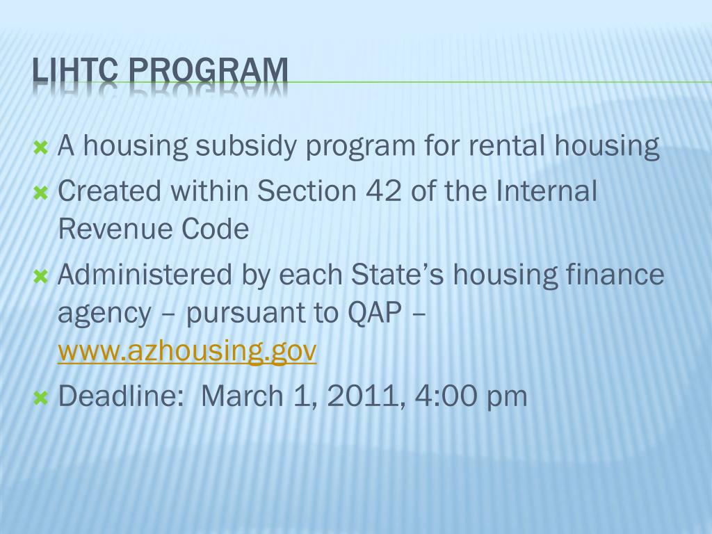A housing subsidy program for rental housing Created within Section 42 of the Internal Revenue Code Administered by each State’s housing finance agency – pursuant to QAP – www.azhousing.gov Deadline: March 1, 2011, 4:00 pm LIHTC PROGRAM