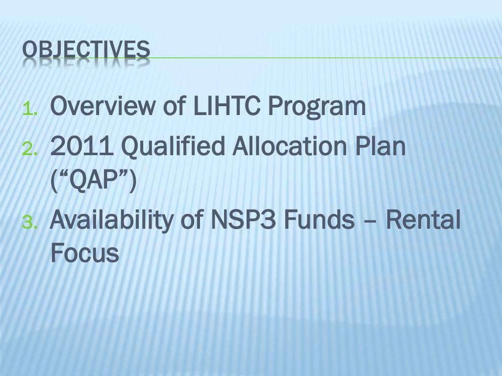 Overview of LIHTC Program 2011 Qualified Allocation Plan (“QAP”) Availability of NSP3 Funds – Rental Focus Objectives