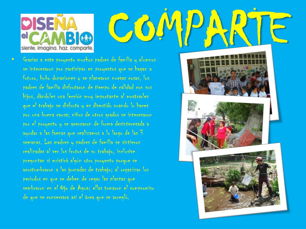 COMPARTE • Gracias a este proyecto muchos padres de familia y alumnos se interesaron por participar en proyectos que se hagan a futuro, hubo donaciones y se planearon nuevas cosas, los padres de familia disfrutaron de tiempo de calidad con sus hijos, dándoles una lección muy importante al mostrarles que el trabajo se disfruta y es divertido cuando lo haces por una buena causa; niños de otros grados se interesaron por el proyecto y se acercaron de forma desinteresada a ayudar a las faenas que realizamos a lo largo de las 3 semanas. Las madres y padres de familia se sintieron realizadas al ver los frutos de su trabajo, inclusive preguntan si existirá algún otro proyecto porque se acostumbraron a las jornadas de trabajo; al organizar los periodos en que se deben de regar las plantas que sembraron en el Ojo de Agua; ellas tomaron el compromiso de que se conservara así el área que se arregló.