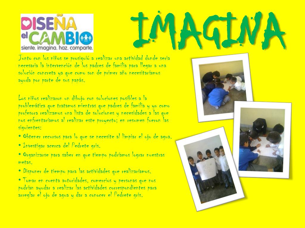 IMAGINA Junto con los niños se prosiguió a realizar una actividad donde seria necesaria la intervención de los padres de familia para llegar a una solución concreta ya que como son de primer año necesitaríamos ayuda por parte de sus papás. Los niños realizaron un dibujo con soluciones posibles a la problemática que tratamos mientras que padres de familia y yo como profesora realizamos una lista de soluciones y necesidades a las que nos enfrentaríamos al realizar este proyecto; en resumen fueron las siguientes: • Obtener recursos para lo que se necesite al limpiar el ojo de agua. • Investigar acerca del Pedrete gris. • Organizarse para saber en que tiempo podríamos lograr nuestras metas. • Disponer de tiempo para las actividades que realizaríamos. • Tomar en cuenta autoridades, comercios y personas que nos podrían ayudar a realizar las actividades correspondientes para arreglar el ojo de agua y dar a conocer el Pedrete gris.