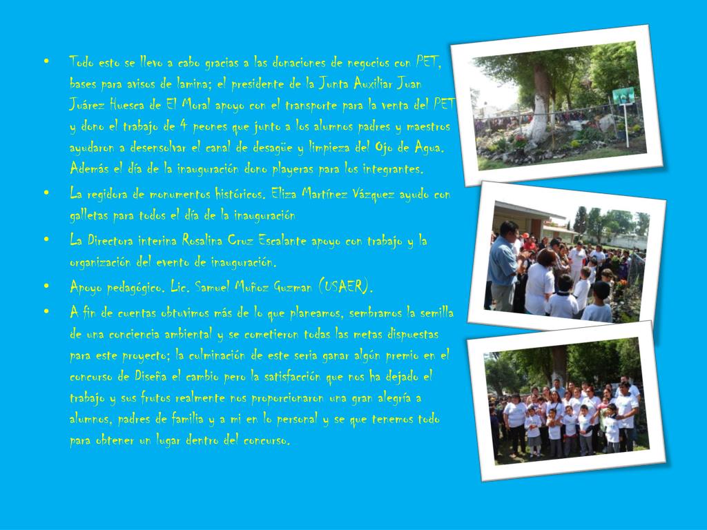 Todo esto se llevo a cabo gracias a las donaciones de negocios con PET, bases para avisos de lamina; el presidente de la Junta Auxiliar Juan Juárez Huesca de El Moral apoyo con el transporte para la venta del PET y dono el trabajo de 4 peones que junto a los alumnos padres y maestros ayudaron a desensolvar el canal de desagüe y limpieza del Ojo de Agua. Además el día de la inauguración dono playeras para los integrantes. • La regidora de monumentos históricos. Eliza Martínez Vázquez ayudo con galletas para todos el día de la inauguración • La Directora interina Rosalina Cruz Escalante apoyo con trabajo y la organización del evento de inauguración. • Apoyo pedagógico. Lic. Samuel Muñoz Guzman (USAER). • A fin de cuentas obtuvimos más de lo que planeamos, sembramos la semilla de una conciencia ambiental y se cometieron todas las metas dispuestas para este proyecto; la culminación de este seria ganar algún premio en el concurso de Diseña el cambio pero la satisfacción que nos ha dejado el trabajo y sus frutos realmente nos proporcionaron una gran alegría a alumnos, padres de familia y a mi en lo personal y se que tenemos todo para obtener un lugar dentro del concurso.