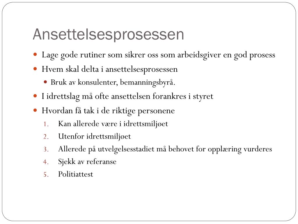 Ansettelsesprosessen • Lage gode rutiner som sikrer oss som arbeidsgiver en god prosess • Hvem skal delta i ansettelsesprosessen • Bruk av konsulenter, bemanningsbyrå. • I idrettslag må ofte ansettelsen forankres i styret • Hvordan få tak i de riktige personene • Kan allerede være i idrettsmiljøet • Utenfor idrettsmiljøet • Allerede på utvelgelsesstadiet må behovet for opplæring vurderes • Sjekk av referanse • Politiattest