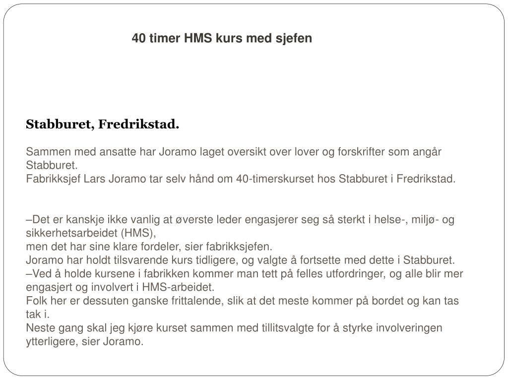 40 timer HMS kurs med sjefen Stabburet, Fredrikstad.ublisert: 30.04.2 Sammen med ansatte har Joramo laget oversikt over lover og forskrifter som angår Stabburet. Fabrikksjef Lars Joramo tar selv hånd om 40-timerskurset hos Stabburet i Fredrikstad. –Det er kanskje ikke vanlig at øverste leder engasjerer seg så sterkt i helse-, miljø- og sikkerhetsarbeidet (HMS), men det har sine klare fordeler, sier fabrikksjefen. Joramo har holdt tilsvarende kurs tidligere, og valgte å fortsette med dette i Stabburet. –Ved å holde kursene i fabrikken kommer man tett på felles utfordringer, og alle blir mer engasjert og involvert i HMS-arbeidet. Folk her er dessuten ganske frittalende, slik at det meste kommer på bordet og kan tas tak i. Neste gang skal jeg kjøre kurset sammen med tillitsvalgte for å styrke involveringen ytterligere, sier Joramo.