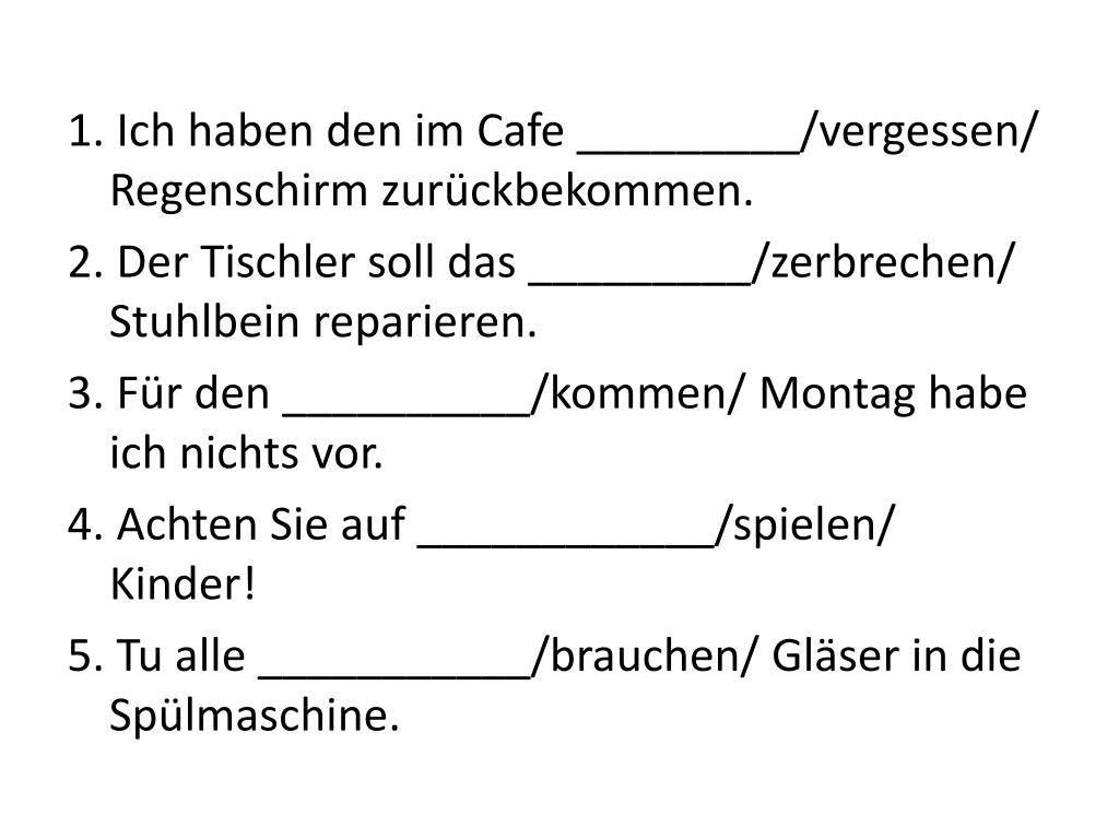 1. Ich haben den im Cafe _________/vergessen/ Regenschirm zurückbekommen. 2. Der Tischler soll das _________/zerbrechen/ Stuhlbein reparieren. 3. Für den __________/kommen/ Montag habe ich nichts vor. 4. Achten Sie auf ____________/spielen/ Kinder! 5. Tu alle ___________/brauchen/ Gläser in die Spülmaschine.