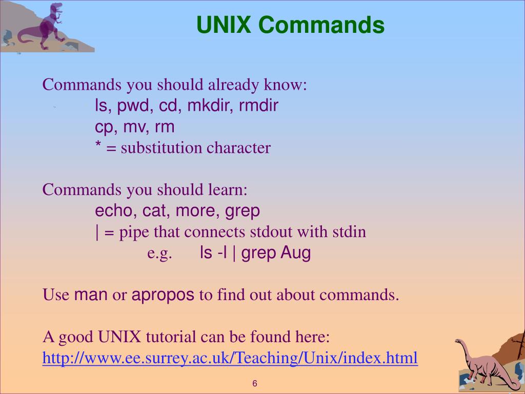 UNIX Commands Commands you should already know: ls, pwd, cd, mkdir, rmdir cp, mv, rm * = substitution character Commands you should learn: echo, cat, more, grep | = pipe that connects stdout with stdin e.g. ls -l | grep Aug Use man or apropos to find out about commands. A good UNIX tutorial can be found here: http://www.ee.surrey.ac.uk/Teaching/Unix/index.html