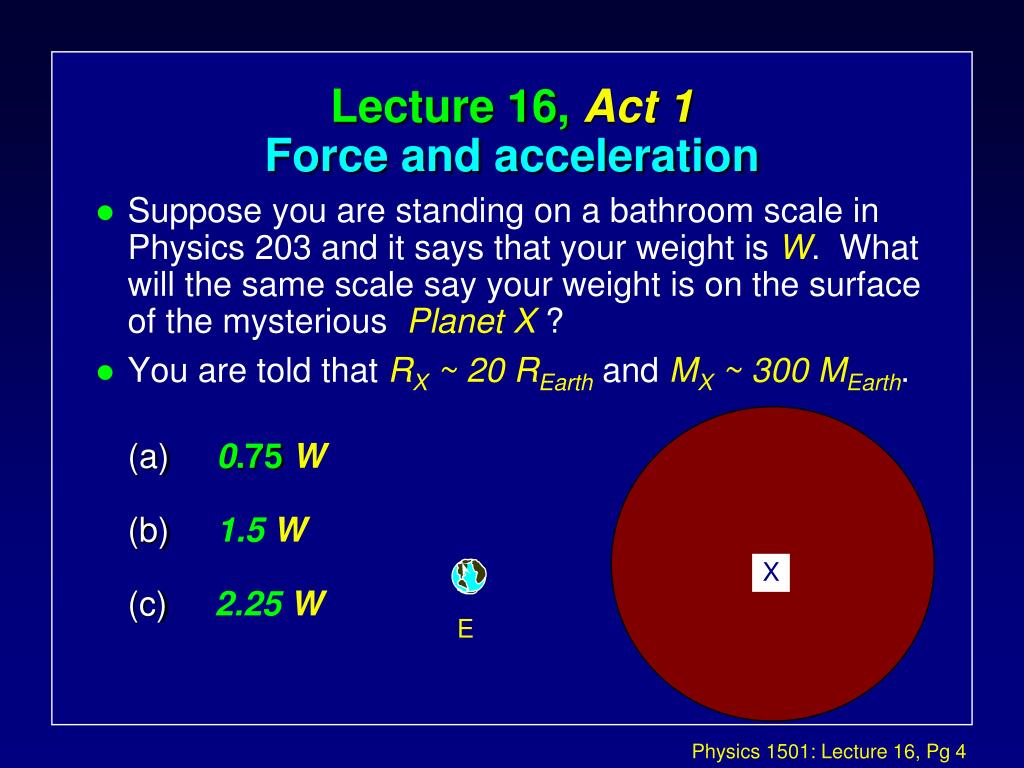 Lecture 16, Act 1Force and acceleration • Suppose you are standing on a bathroom scale in Physics 203 and it says that your weight is W. What will the same scale say your weight is on the surface of the mysterious Planet X ? • You are told that RX ~ 20 REarth and MX ~ 300 MEarth. (a)0.75W (b)1.5 W(c)2.25 W X E