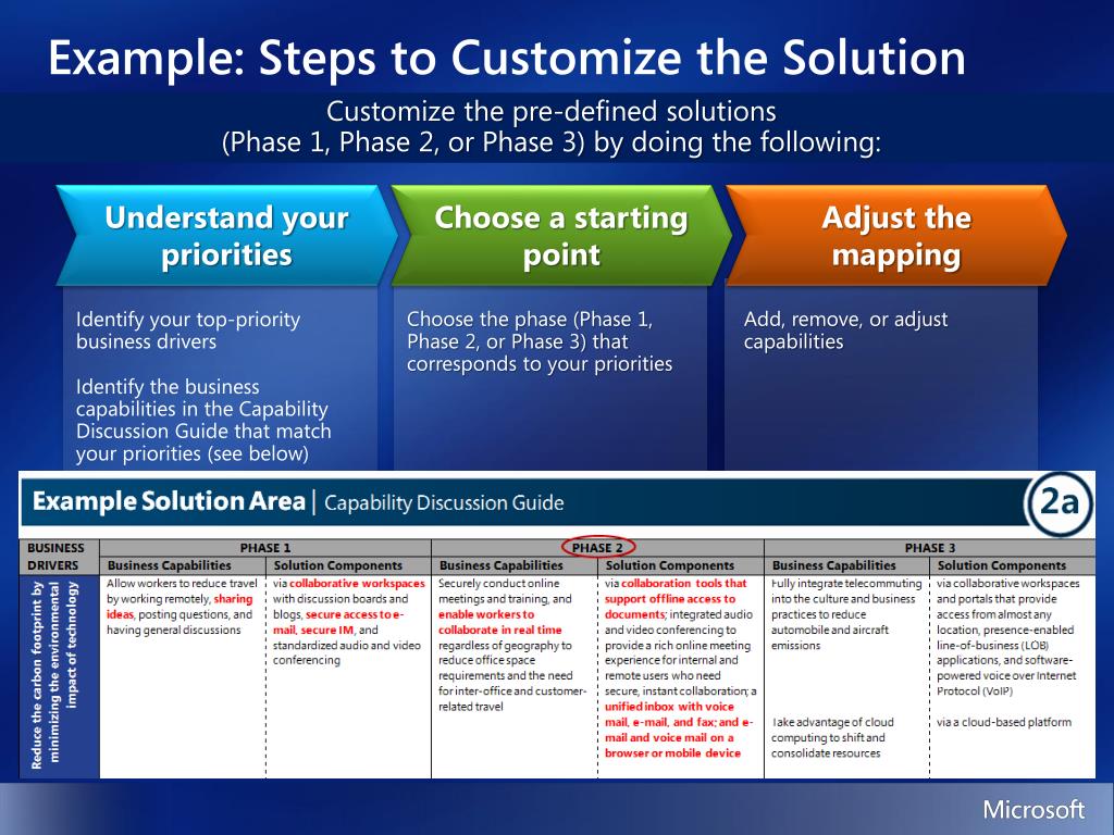 Identify your top-priority business drivers Identify the business capabilities in the Capability Discussion Guide that match your priorities (see below) Example: Steps to Customize the Solution Customize the pre-defined solutions (Phase 1, Phase 2, or Phase 3) by doing the following: • Understand your priorities • Choose a starting point • Adjust the mapping Choose the phase (Phase 1, Phase 2, or Phase 3) that corresponds to your priorities Add, remove, or adjust capabilities