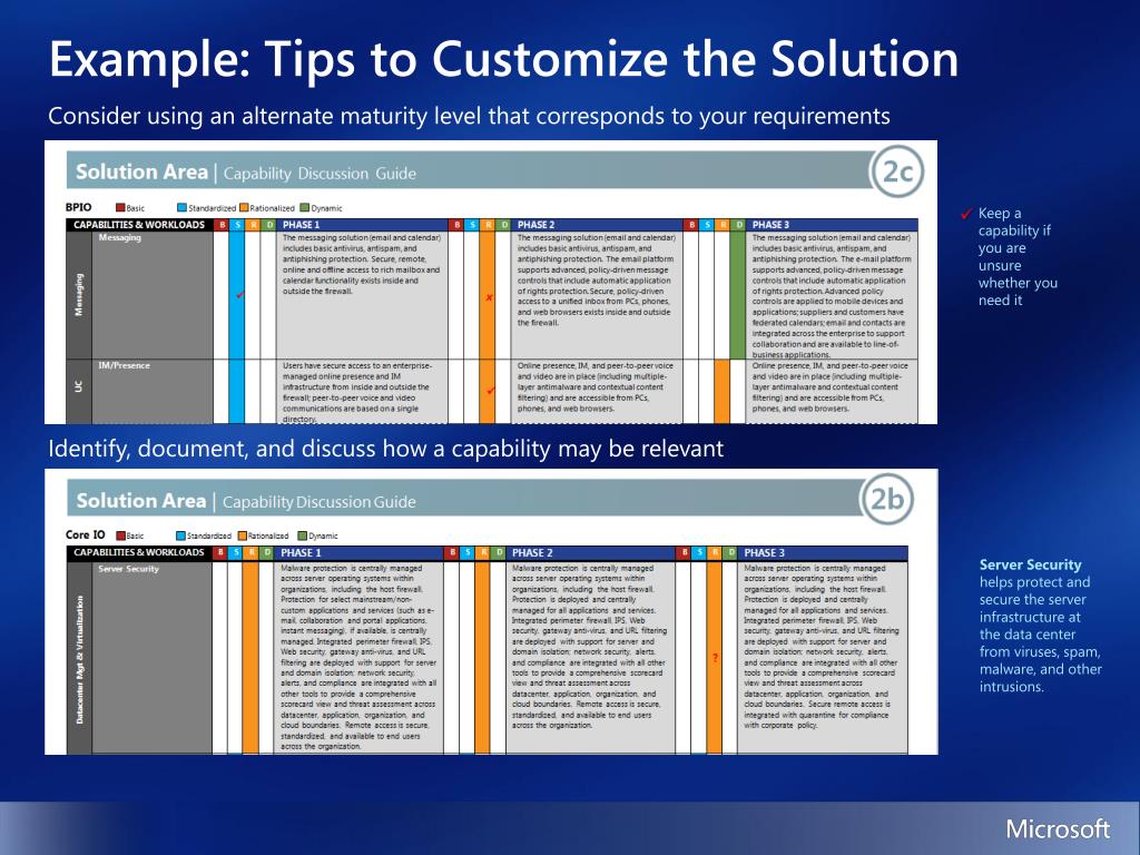Example: Tips to Customize the Solution Consider using an alternate maturity level that corresponds to your requirements Keep a capability if you are unsure whether you need it Identify, document, and discuss how a capability may be relevant