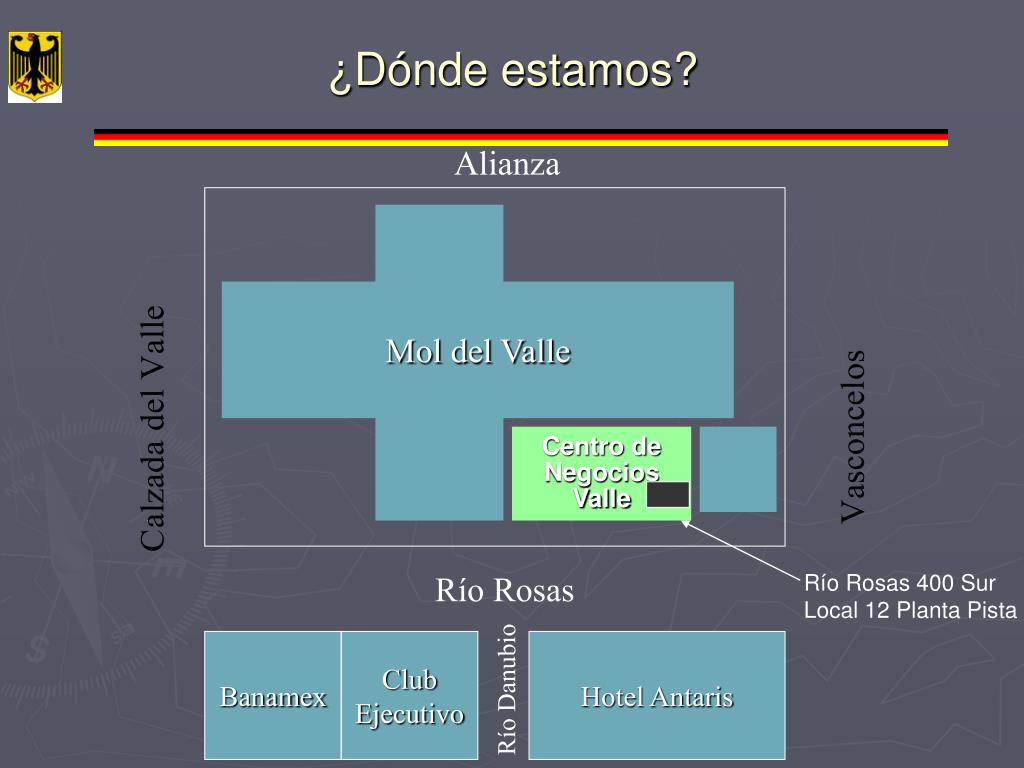 ¿Dónde estamos? Alianza Mol del Valle Centro de Negocios Valle Río Rosas Río Rosas 400 Sur Local 12 Planta Pista Banamex Club Ejecutivo Hotel Antaris Río Danubio