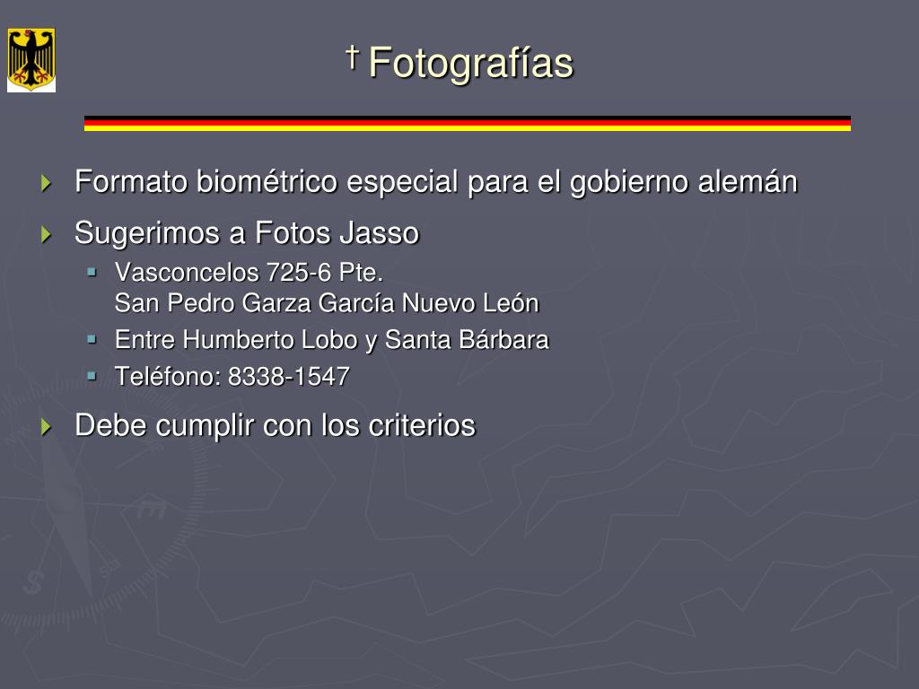 † Fotografías • Formato biométrico especial para el gobierno alemán • Sugerimos a Fotos Jasso • Vasconcelos 725-6 Pte.San Pedro Garza García Nuevo León • Entre Humberto Lobo y Santa Bárbara • Teléfono: 8338-1547 • Debe cumplir con los criterios