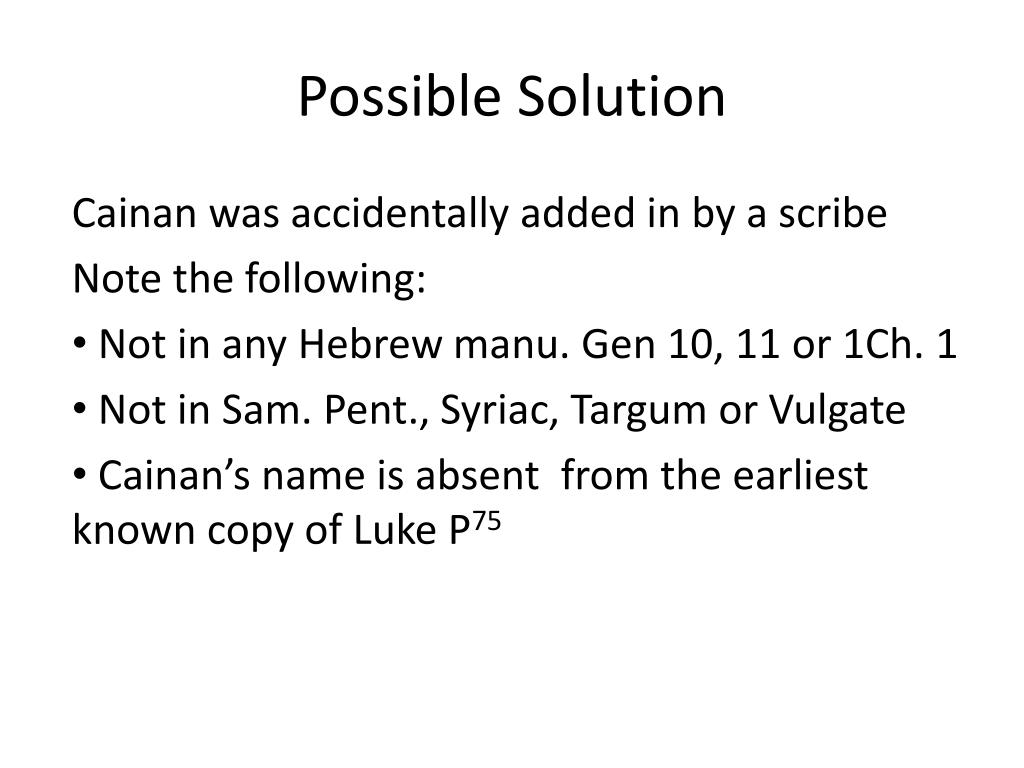 Possible Solution Cainan was accidentally added in by a scribe Note the following: • Not in any Hebrew manu. Gen 10, 11 or 1Ch. 1 • Not in Sam. Pent., Syriac, Targum or Vulgate • Cainan’s name is absent from the earliest known copy of Luke P75