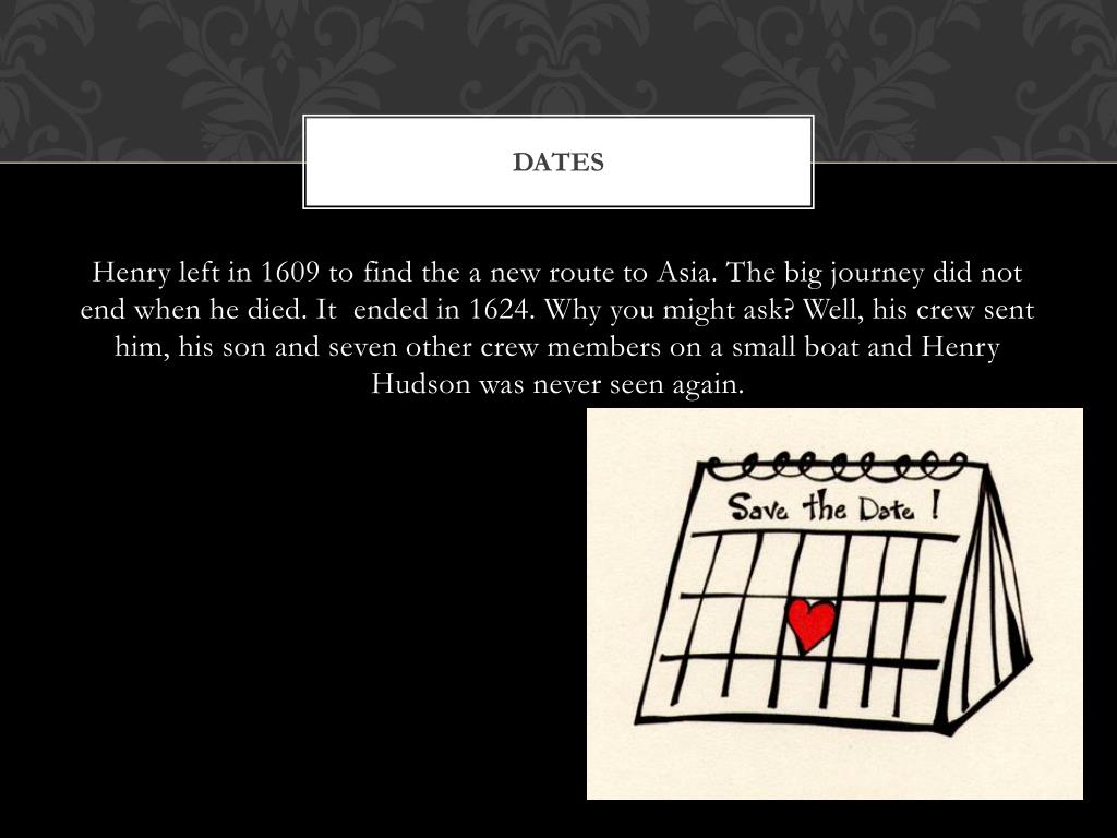 Dates Henry left in 1609 to find the a new route to Asia. The big journey did not end when he died. It ended in 1624. Why you might ask? Well, his crew sent him, his son and seven other crew members on a small boat and Henry Hudson was never seen again.