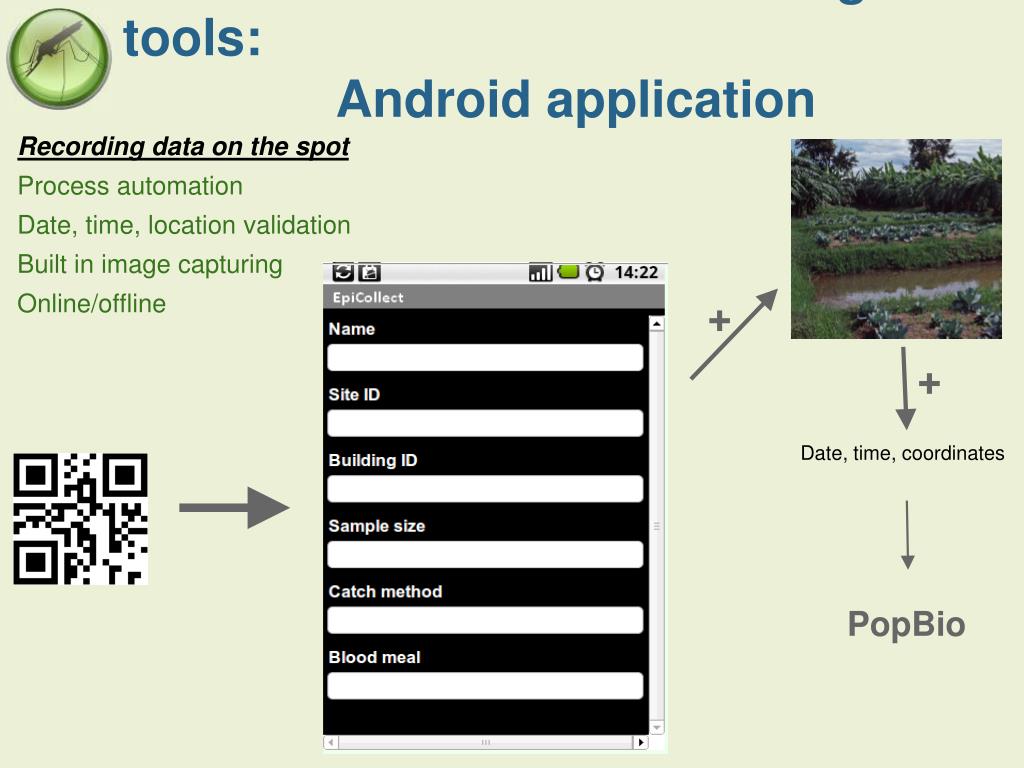 Data collection and recording tools: Android application Recording data on the spot Process automation Date, time, location validation Built in image capturing Online/offline + + Date, time, coordinates PopBio