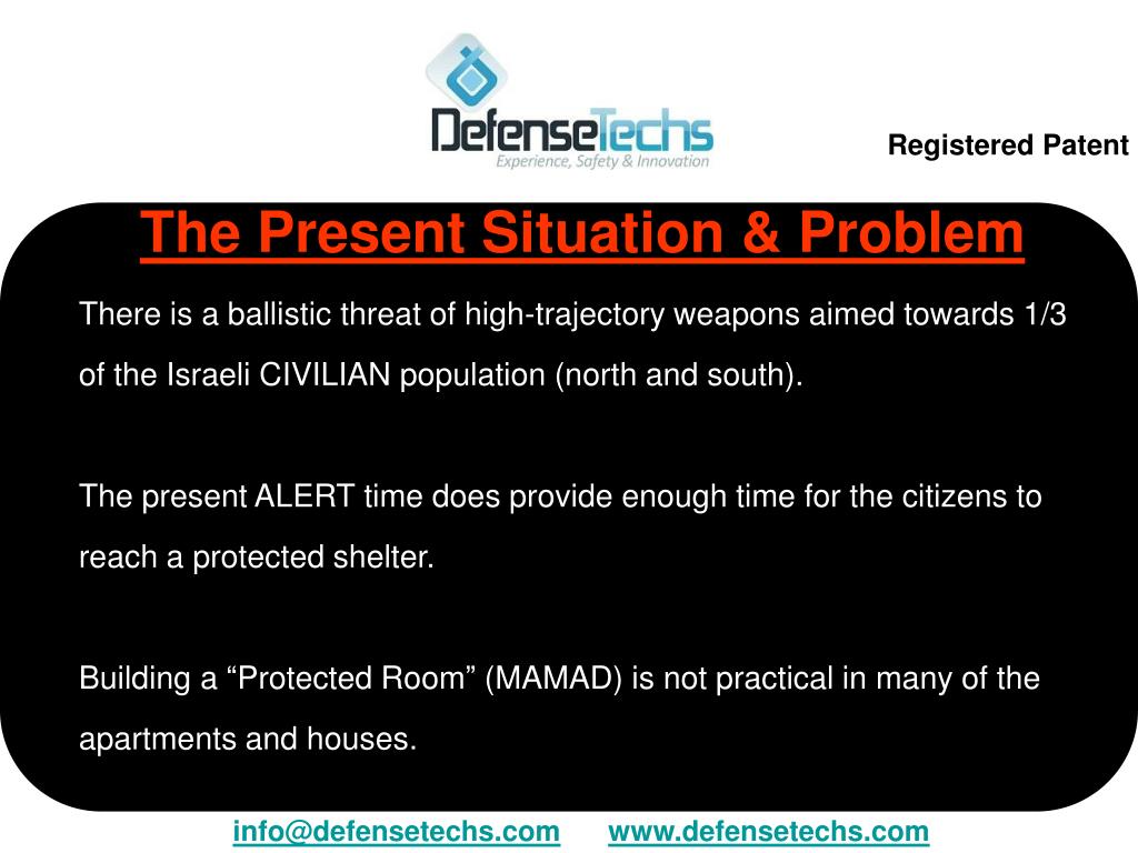 Registered Patent The Present Situation & Problem There is a ballistic threat of high-trajectory weapons aimed towards 1/3 of the Israeli CIVILIAN population (north and south). The present ALERT time does provide enough time for the citizens to reach a protected shelter. Building a “Protected Room” (MAMAD) is not practical in many of the apartments and houses. info@defensetechs.comwww.defensetechs.com