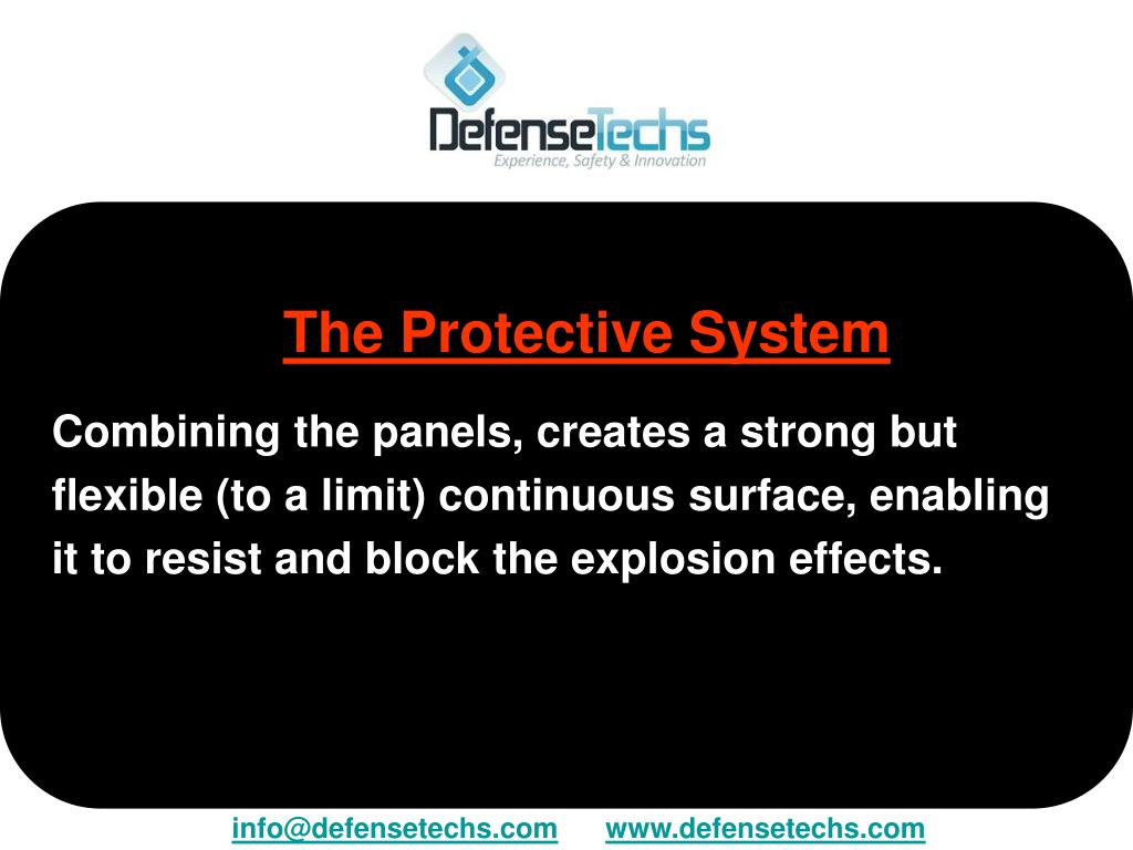 The Protective System Combining the panels, creates a strong but flexible (to a limit) continuous surface, enabling it to resist and block the explosion effects. info@defensetechs.comwww.defensetechs.com