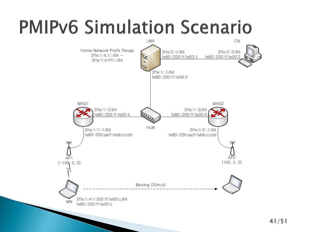 PMIPv6 Simulation Scenario • Setup PMIPv6 //attach PMIPv6 agents Pmip6ProfileHelper *profile = new Pmip6ProfileHelper(); //adding profile for each station profile->AddProfile(Identifier("pmip1@example.com"), Identifier(Mac48Address::ConvertFrom(staDevs.Get(0)->GetAddress())), backboneIfs.GetAddress(0, 1), std::list<Ipv6Address>()); Pmip6LmaHelper lmahelper; lmahelper.SetPrefixPoolBase(Ipv6Address("3ffe:1:4::"), 48); lmahelper.SetProfileHelper(profile); lmahelper.Install(lma.Get(0)); Pmip6MagHelper maghelper; maghelper.SetProfileHelper(profile); maghelper.Install (mags.Get(0), mag1Ifs.GetAddress(0, 0), aps.Get(0)); maghelper.Install (mags.Get(1), mag2Ifs.GetAddress(0, 0), aps.Get(1));