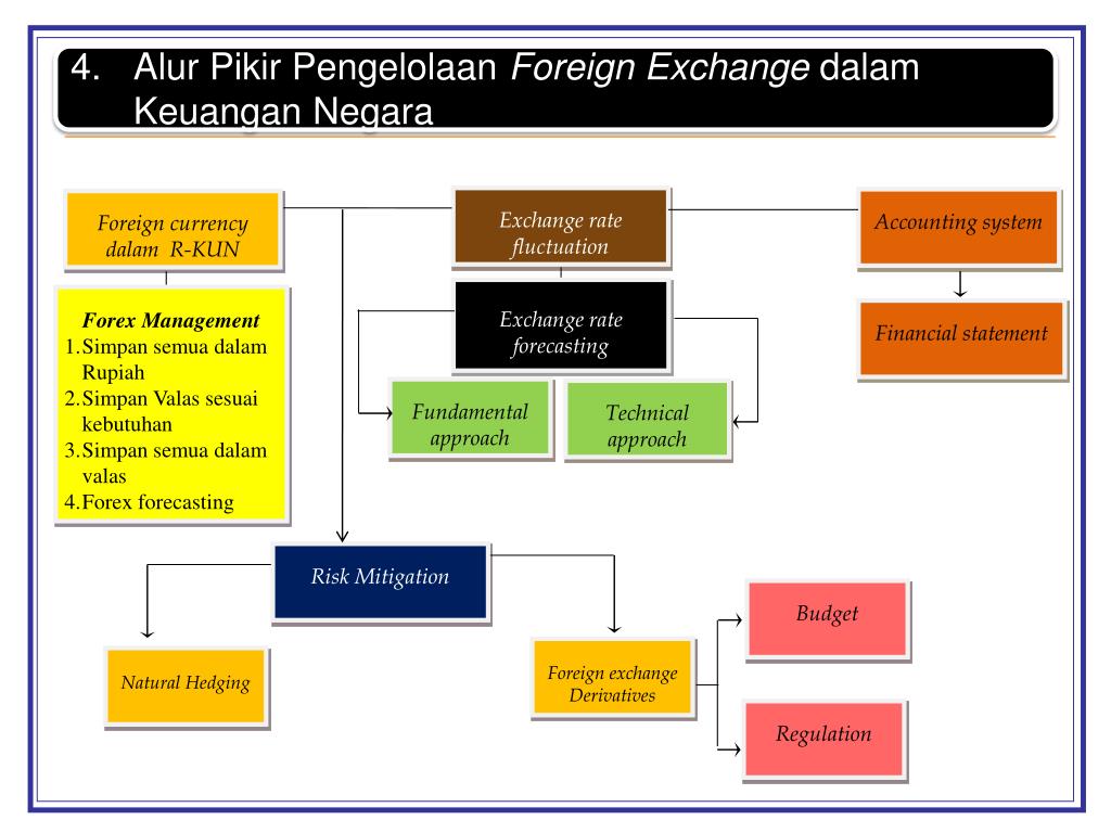 AlurPikirPengelolaanForeign Exchange dalamKeuangan Negara Exchange rate fluctuation Accounting system Foreign currency dalamR-KUN Exchange rate forecasting Forex Management • Simpan semua dalam Rupiah • Simpan Valas sesuai kebutuhan • Simpan semua dalam valas • Forex forecasting Financial statement Fundamentalapproach Technical approach Risk Mitigation Budget Foreign exchange Derivatives Natural Hedging Regulation