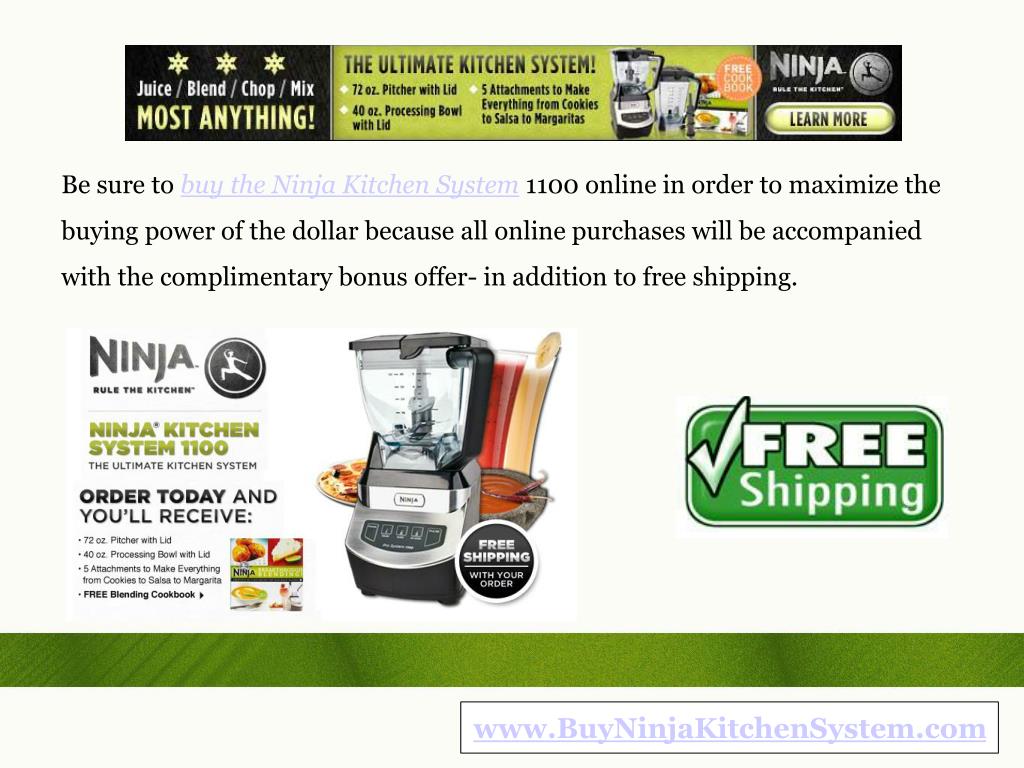 Be sure to buy the Ninja Kitchen System 1100 online in order to maximize the buying power of the dollar because all online purchases will be accompanied with the complimentary bonus offer- in addition to free shipping. www.BuyNinjaKitchenSystem.com