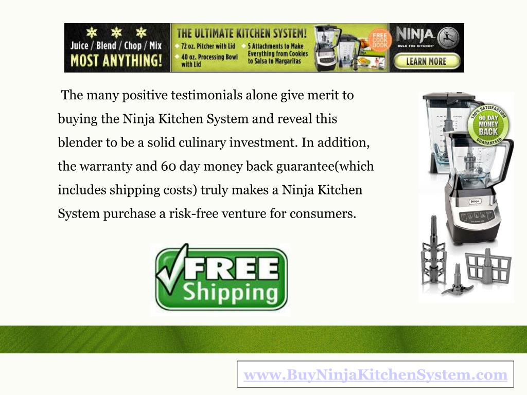 The many positive testimonials alone give merit to buying the Ninja Kitchen System and reveal this blender to be a solid culinary investment. In addition, the warranty and 60 day money back guarantee(which includes shipping costs) truly makes a Ninja Kitchen System purchase a risk-free venture for consumers. www.BuyNinjaKitchenSystem.com