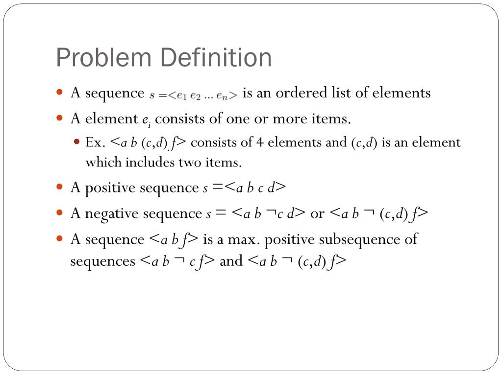 Problem Definition • A sequence is an ordered list of elements • A element ei consists of one or more items. • Ex. <ab (c,d) f> consists of 4 elements and (c,d) is an element which includes two items. • A positive sequence s =<a b c d> • A negative sequence s = <a b ¬c d> or <a b¬ (c,d) f> • A sequence <a b f> is a max. positive subsequence of sequences <a b ¬ c f> and <a b¬ (c,d) f>