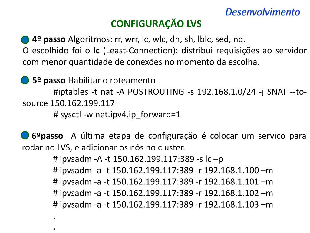 Desenvolvimento CONFIGURAÇÃO LVS • 4º passo Algoritmos: rr, wrr, lc, wlc, dh, sh, lblc, sed, nq. • O escolhido foi o lc(Least-Connection): distribui requisições ao servidor com menor quantidade de conexões no momento da escolha. • 5º passo Habilitar o roteamento • #iptables -t nat -A POSTROUTING -s 192.168.1.0/24 -j SNAT --to-source 150.162.199.117 • # sysctl -w net.ipv4.ip_forward=1 • 6ºpasso A última etapa de configuração é colocar um serviço para rodar no LVS, e adicionar os nós no cluster. • # ipvsadm -A -t 150.162.199.117:389 -s lc –p • # ipvsadm -a -t 150.162.199.117:389 -r 192.168.1.100 –m • # ipvsadm -a -t 150.162.199.117:389 -r 192.168.1.101 –m • # ipvsadm -a -t 150.162.199.117:389 -r 192.168.1.102 –m • # ipvsadm -a -t 150.162.199.117:389 -r 192.168.1.103 –m • . • .