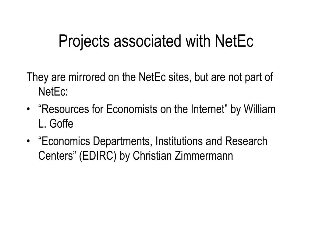 Projects associated with NetEc They are mirrored on the NetEc sites, but are not part of NetEc: • “Resources for Economists on the Internet” by William L. Goffe • “Economics Departments, Institutions and Research Centers” (EDIRC) by Christian Zimmermann