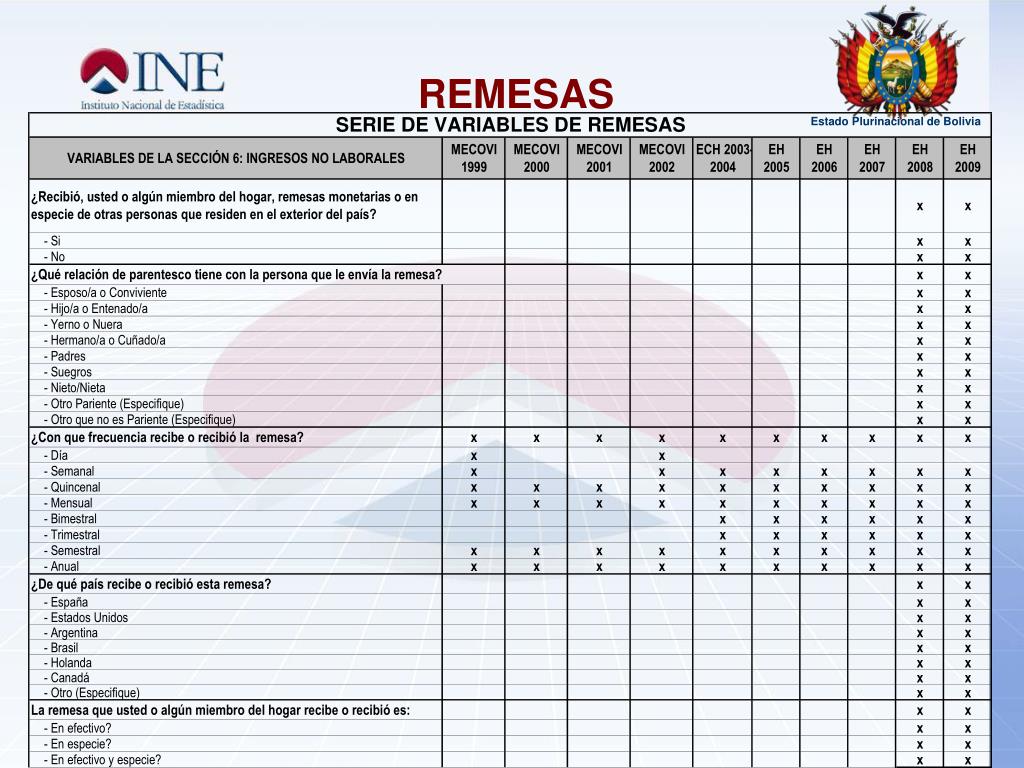 Estado Plurinacional de Bolivia INGRESOS NO LABORALES DEL HOGAR REMESAS Esta sección permite… Identifica los ingresos que el hogar percibe con regularidad, los cuales no provienen de una actividad económica. Se pretende identificar el impacto socioeconómico de las remesas en los hogares bolivianos, a partir de la caracterización del envío, la frecuencia, recepción y destino de las remesas.