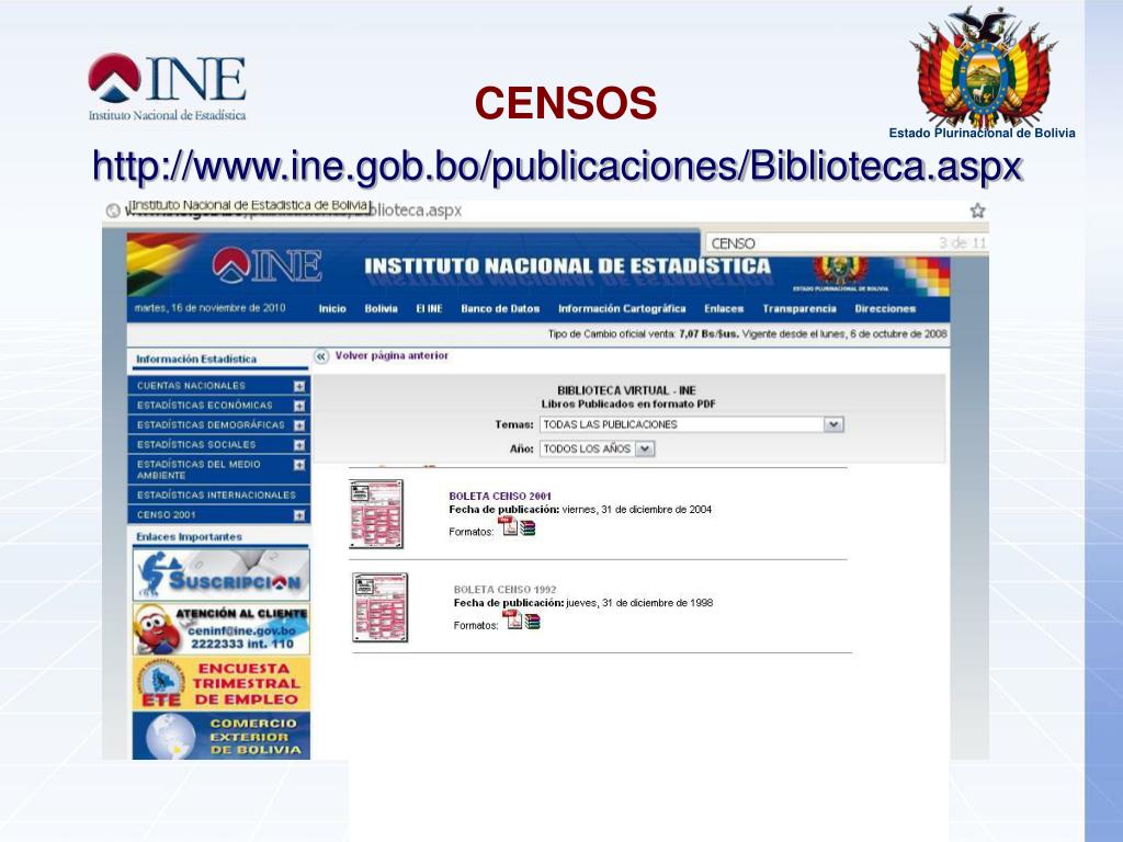 Estado Plurinacional de Bolivia CENSOS http://www.ine.gob.bo/publicaciones/Biblioteca.aspx