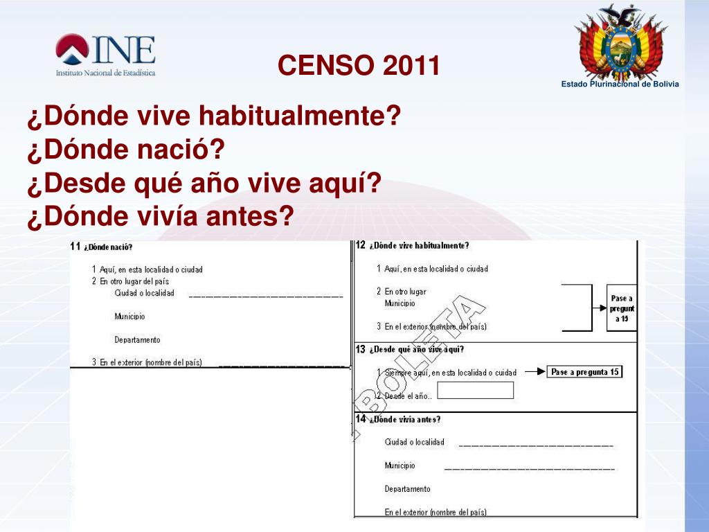 Estado Plurinacional de Bolivia CENSO 2011 ¿Dónde vive habitualmente? ¿Dónde nació? ¿Desde qué año vive aquí? ¿Dónde vivía antes?