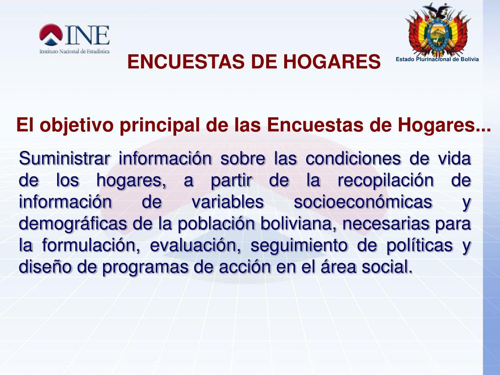 Estado Plurinacional de Bolivia ENCUESTAS DE HOGARES El objetivo principal de las Encuestas de Hogares... Suministrar información sobre las condiciones de vida de los hogares, a partir de la recopilación de información de variables socioeconómicas y demográficas de la población boliviana, necesarias para la formulación, evaluación, seguimiento de políticas y diseño de programas de acción en el área social.
