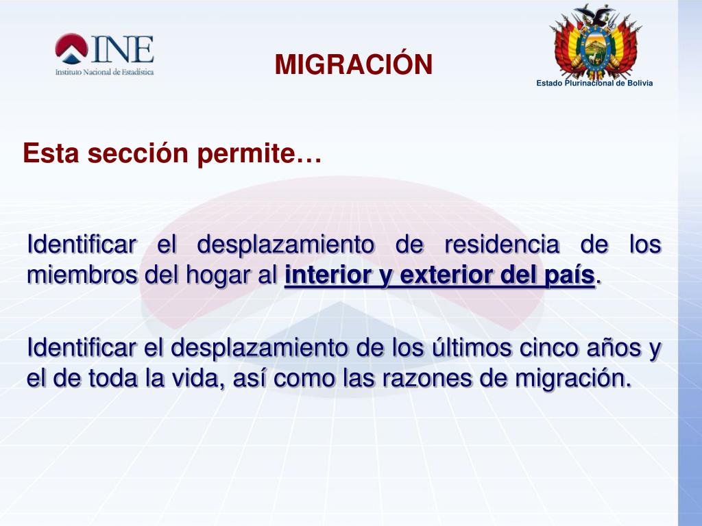 Estado Plurinacional de Bolivia MIGRACIÓN Esta sección permite… Identificar el desplazamiento de residencia de los miembros del hogar al interior y exterior del país. Identificar el desplazamiento de los últimos cinco años y el de toda la vida, así como las razones de migración.