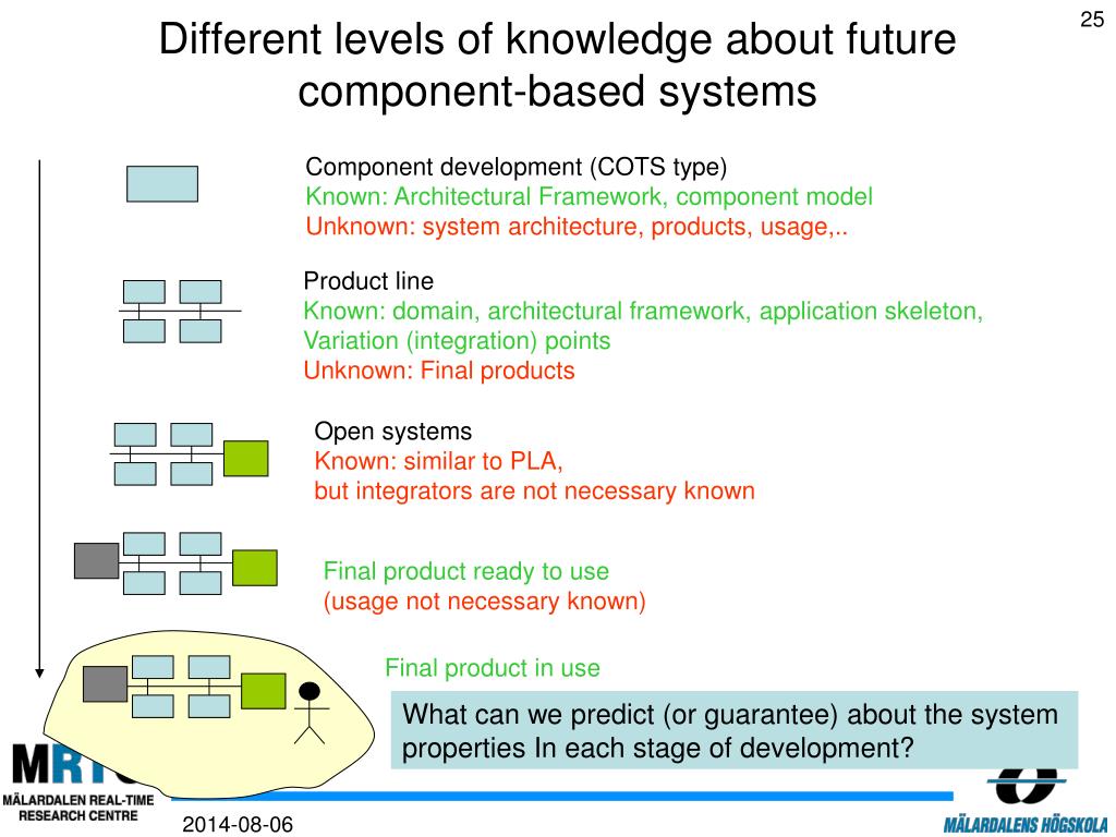 Different levels of knowledge about future component-based systems Component development (COTS type) Known: Architectural Framework, component model Unknown: system architecture, products, usage,.. Product line Known: domain, architectural framework, application skeleton,Variation (integration) points Unknown: Final products Open systems Known: similar to PLA,but integrators are not necessary known Final product ready to use (usage not necessary known) Final product in use What can we predict (or guarantee) about the system properties In each stage of development?