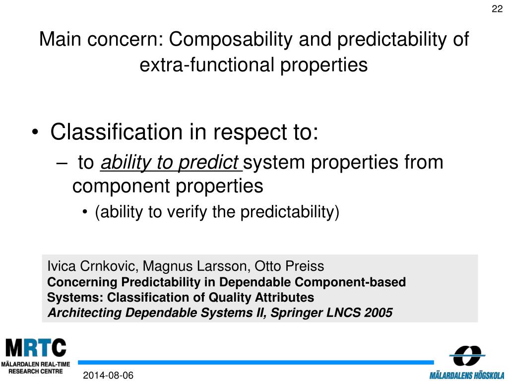 Main concern: Composability and predictability ofextra-functional properties • Classification in respect to: • to ability to predict system properties from component properties • (ability to verify the predictability) Ivica Crnkovic, Magnus Larsson, Otto Preiss Concerning Predictability in Dependable Component-based Systems: Classification of Quality Attributes Architecting Dependable Systems II, Springer LNCS 2005