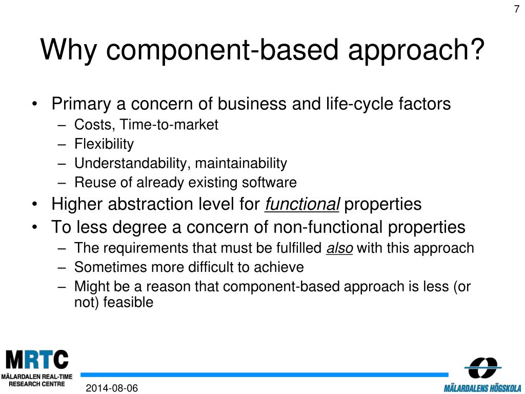 Why component-based approach? • Primary a concern of business and life-cycle factors • Costs, Time-to-market • Flexibility • Understandability, maintainability • Reuse of already existing software • Higher abstraction level for functional properties • To less degree a concern of non-functional properties • The requirements that must be fulfilled also with this approach • Sometimes more difficult to achieve • Might be a reason that component-based approach is less (or not) feasible