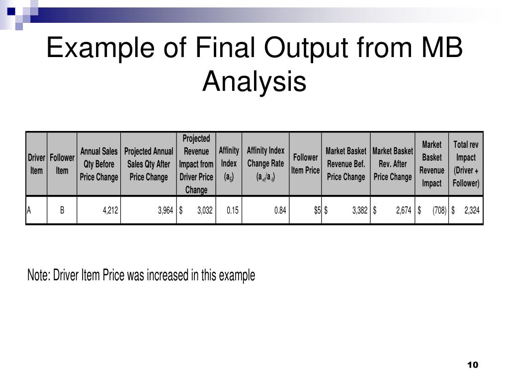 Measure effect of Price Change of An Item on Market Basket. Mayur Sedani Sr. Merchandising Analyst Pricing and Product Optimization AutoZone Inc. Background on Market Basket (MB) Analysis. Aimed at providing insight into combination of products sold together (in a customer basket)