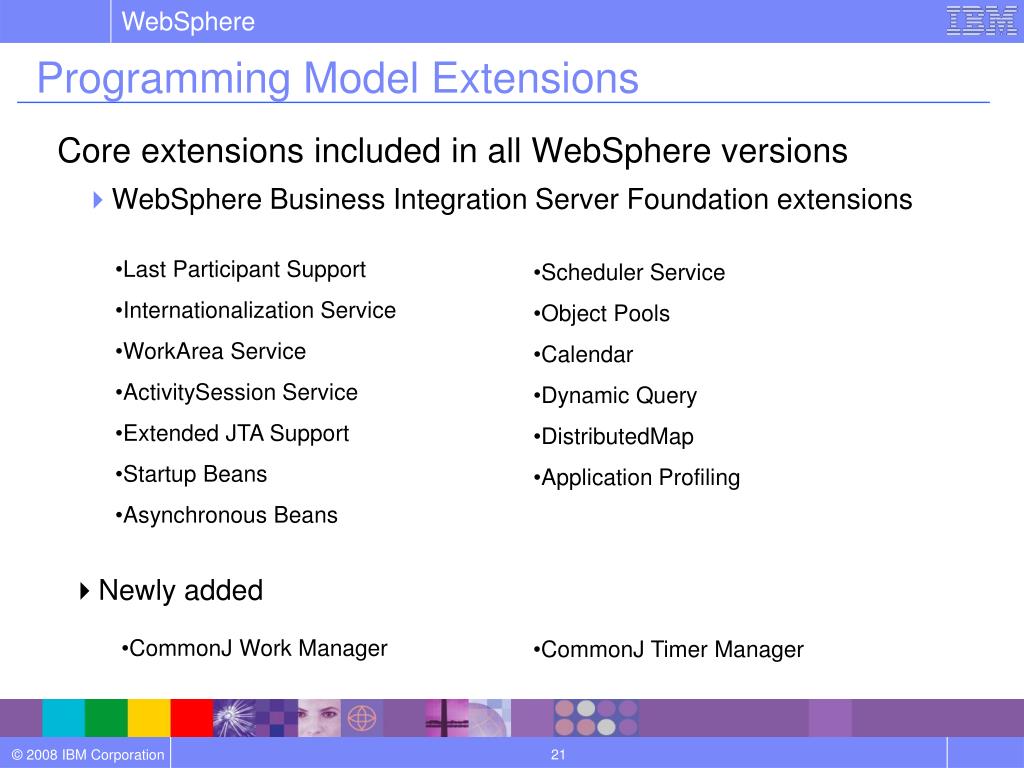 Programming Model Extensions Core extensions included in all WebSphere versions • WebSphere Business Integration Server Foundation extensions • Last Participant Support • Internationalization Service • WorkArea Service • ActivitySession Service • Extended JTA Support • Startup Beans • Asynchronous Beans • Scheduler Service • Object Pools • Calendar • Dynamic Query • DistributedMap • Application Profiling • Newly added • CommonJ Work Manager • CommonJ Timer Manager