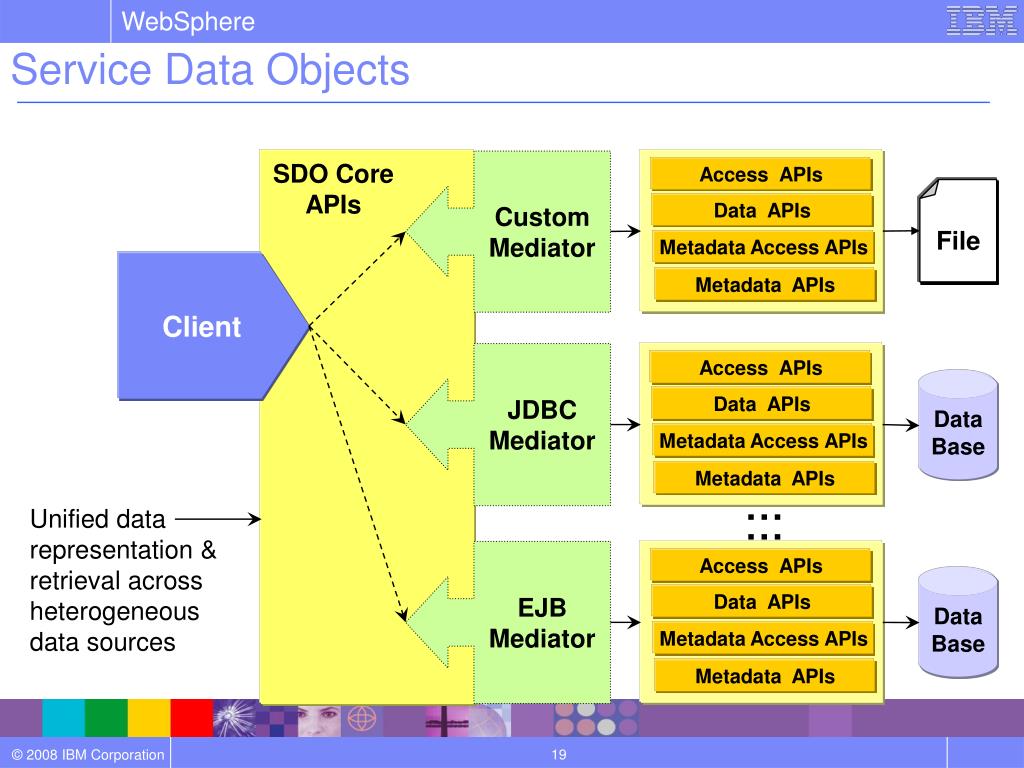 Access APIs Access APIs Access APIs Data APIs Data APIs Data APIs Metadata Access APIs Metadata Access APIs Metadata Access APIs Metadata APIs Metadata APIs Metadata APIs … … Service Data Objects Custom Mediator SDO Core APIs File Client JDBC Mediator Data Base • Unified data representation & retrieval across heterogeneous data sources EJB Mediator Data Base