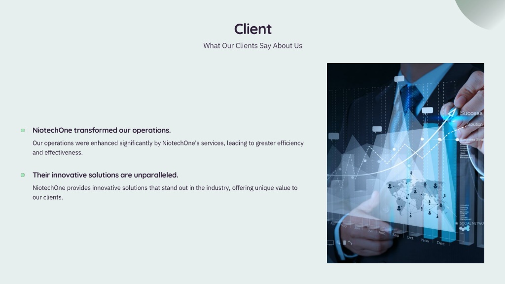 Client Testimonials What Our Clients Say About Us NiotechOne transformed our operations. Our operations were enhanced significantly by NiotechOne's services, leading to greater efficiency and effectiveness. Their innovative solutions are unparalleled. NiotechOne provides innovative solutions that stand out in the industry, offering unique value to our clients.