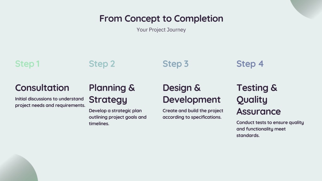 From Concept to Completion Your Project Journey Step 4 Step 1 Step 2 Step 3 Testing & Quality Assurance Consultation Planning & Strategy Design & Development Initial discussions to understand project needs and requirements. Develop a strategic plan outlining project goals and timelines. Create and build the project according to specifications. Conduct tests to ensure quality and functionality meet standards.