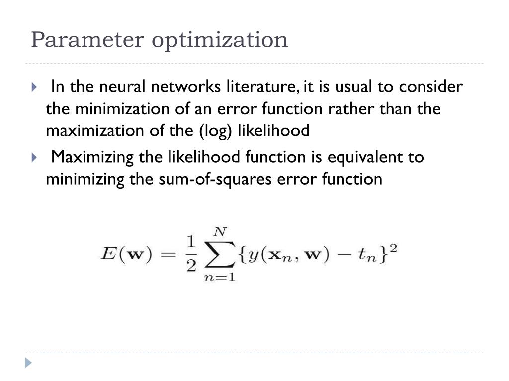 Parameter optimization • In the neural networks literature, it is usual to consider the minimization of an error function rather than the maximization of the (log) likelihood • Maximizing the likelihood function is equivalent to minimizing the sum-of-squares error function