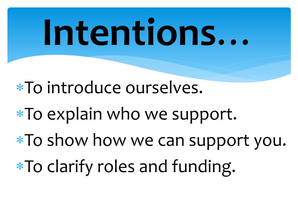 Intentions… To introduce ourselves. To explain who we support. To show how we can support you. To clarify roles and funding.