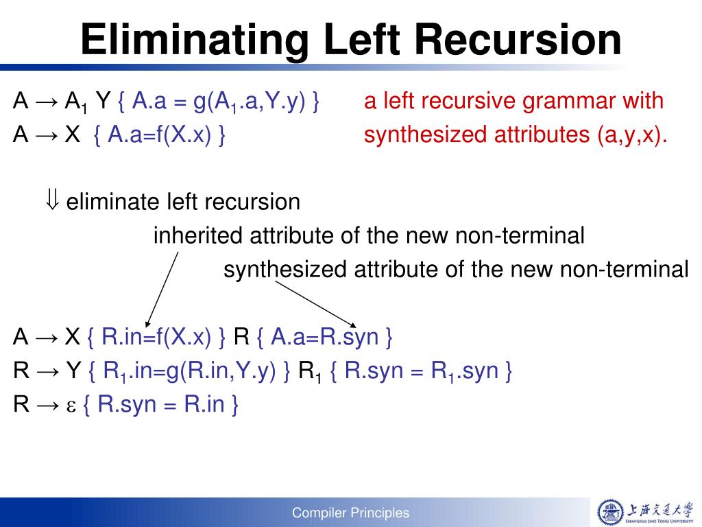 Eliminating Left Recursion Cont’d A parse tree of left recursive grammar A Y A.a=g(f(X.x),Y.y) parse tree of non-left-recursive grammar X X.x=f(X.x) A X R.in=f(X.x) R A.a=g(f(X.x,Y.y) Y R1.in=g(f(X.x),Y.y) R1R.syn=g(f(X.x),Y.y) R1.syn=R1.in