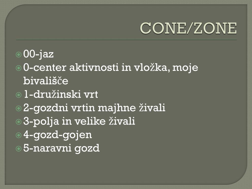 CONE/ZONE 00-jaz 0-center aktivnosti in vložka, moje bivališče 1-družinski vrt 2-gozdni vrtin majhne živali 3-polja in velike živali 4-gozd-gojen 5-naravni gozd