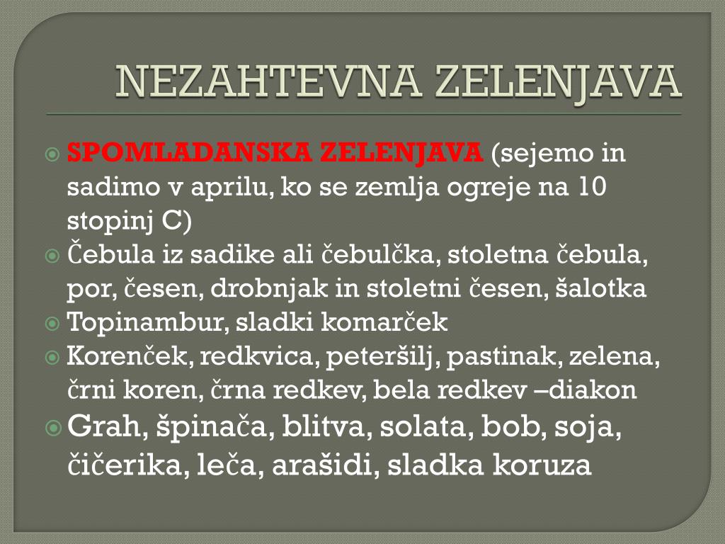 NEZAHTEVNA ZELENJAVA SPOMLADANSKA ZELENJAVA (sejemo in sadimo v aprilu, ko se zemlja ogreje na 10 stopinj C) Čebula iz sadike ali čebulčka, stoletna čebula, por, česen, drobnjak in stoletni česen, šalotka Topinambur, sladki komarček Korenček, redkvica, peteršilj, pastinak, zelena, črni koren, črna redkev, bela redkev –diakon Grah, špinača, blitva, solata, bob, soja, čičerika, leča, arašidi, sladka koruza