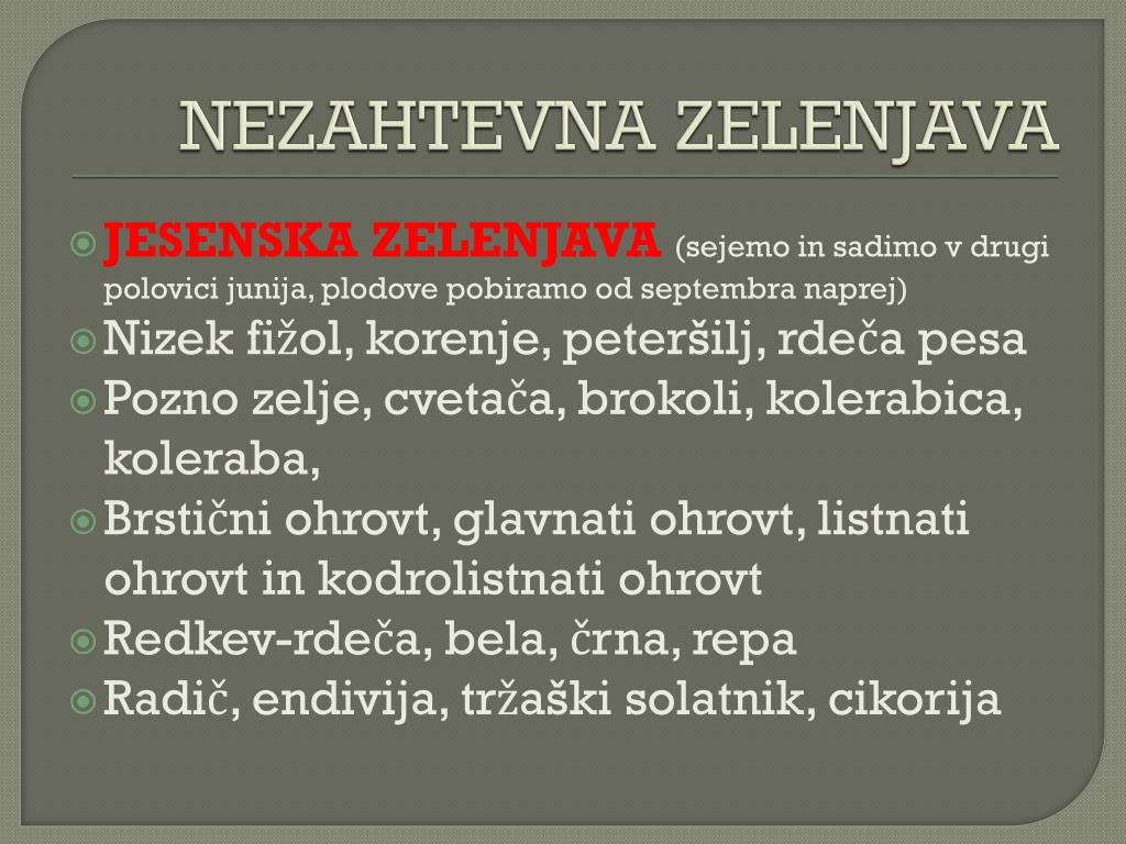 NEZAHTEVNA ZELENJAVA JESENSKA ZELENJAVA (sejemo in sadimo v drugi polovici junija, plodove pobiramo od septembra naprej) Nizek fižol, korenje, peteršilj, rdeča pesa Pozno zelje, cvetača, brokoli, kolerabica, koleraba, Brstični ohrovt, glavnati ohrovt, listnati ohrovt in kodrolistnati ohrovt Redkev-rdeča, bela, črna, repa Radič, endivija, tržaški solatnik, cikorija